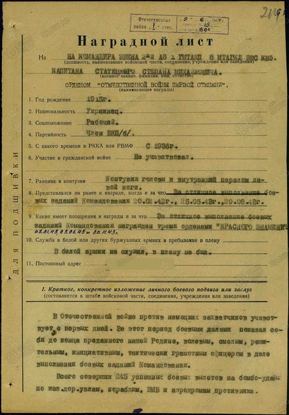 Летчик, лейтенант Статецкий С.М. получил легкие ушибы головы, повреждение левой ноги.