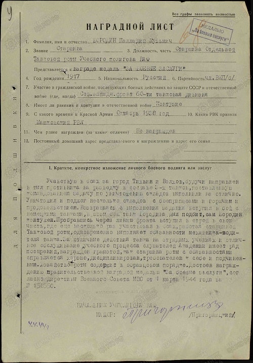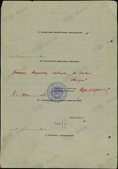 Достоин награждения правительственной наградой Медалью "За боевые заслуги", согласно директиве Военного Совета МВО от 01 марта 1944 года за Nº 150550.