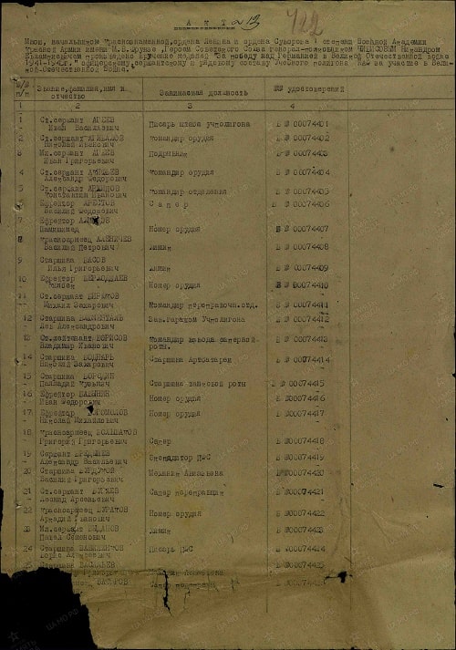 указан также в качестве награжденного Медалью "За победу над Германией в Великой Отечественной войне 1941-1945 гг." под номером 15 на основании текста Акта Краснознаменной Ордена Ленина и Ордена Суворова I степени Военной Академии Красной Армии имени М. В. Фрунзе Nº 13