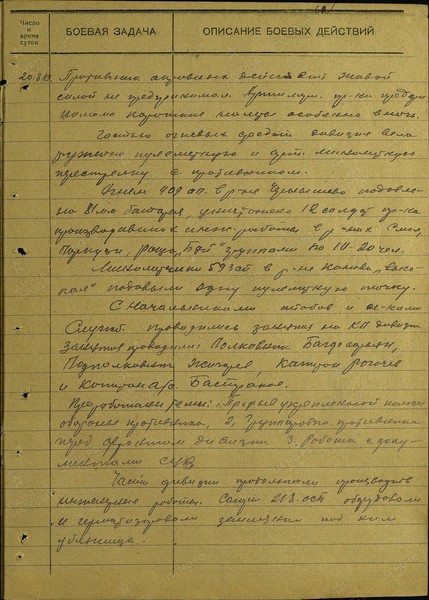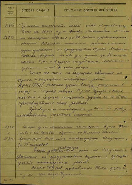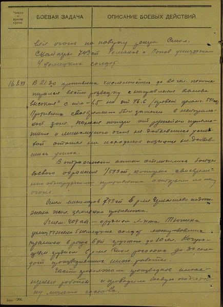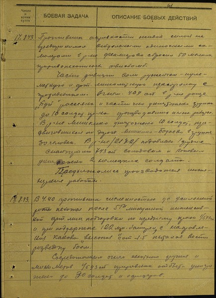 Огнем 409 АП своим огнем в р-не Чернышево подавила миномет, в р-не 1870 150 мм. 2-х орудийную батарею, в р-не Смол уничтожено 6 солдат производивших инж. работы.