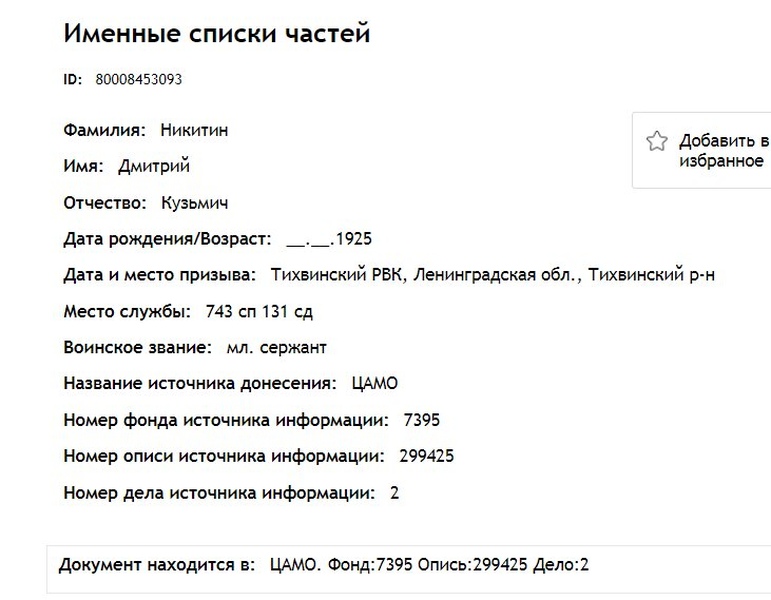 Справка: по воину «Никитин Дмитрий Кузьмич 17.01.1925 (Кузмич» строка в эксель-базе призывников по Тихвину и Тихвинскому р-ну выглядит так: