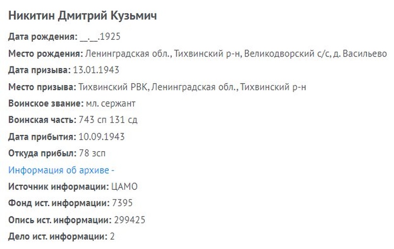 Никитин Дмитрий Кузьмич 25.01.1925 (Кузмич 1925 14.01.1942 48 ЗСП мл. сержант п 1532265438 1942_2_276_186 пр.б/в _.02.1943 743 СП, 131 СД (п/п 09490-Я 10.09.1943 61292231 1156109297 1156099350 1156464224 401886689 ВПП 1997058284 ВПП 1997027141 ВПП 101362162 ВПП 1984375580 ВПП 1984758297