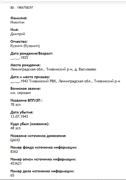 Никитин Дмитрий Кузьмич 25.01.1925 (Кузмич 1925 14.01.1942 48 ЗСП мл. сержант п 1532265438 1942_2_276_186 пр.б/в _.02.1943 61292231 1156109297 1156099350 1156464224 401886689 ВПП 1997058284 ВПП 1997027141 ВПП 101362162 ВПП 1984375580 ВПП 1984758297