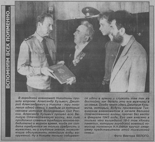 * 28.02.2000 по моей договорённости с Тихвинским военкомом, мой папа «Никитин Александр Кузьмич 28.11.1926» был приглашён в РВК, для торжественного вручения Книги Памяти со строкой на стр. 216 «Никитин Дмитрий Кузьмич 17.01.1925 (Кузмич», с напутствием военкома (см. архив Книга Памяти