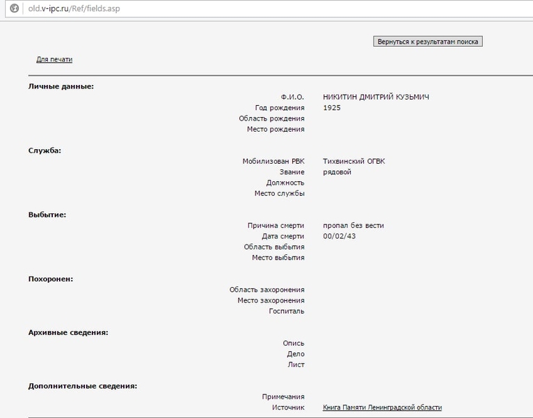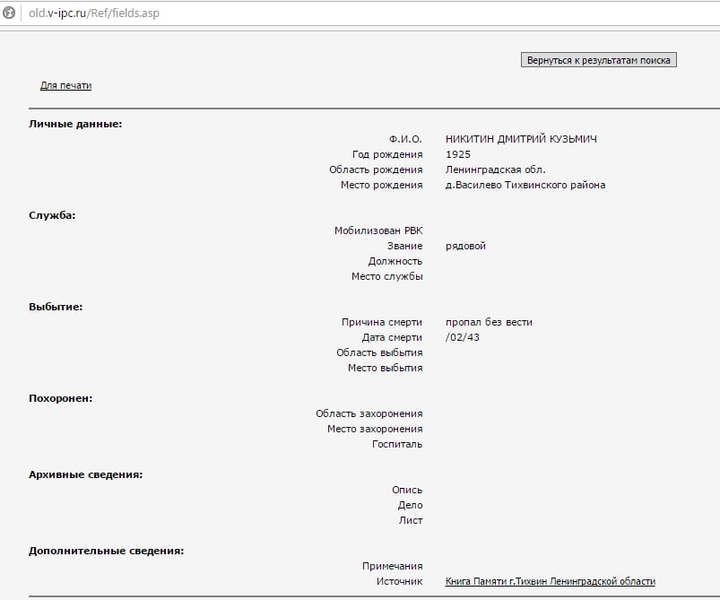 * и всё-таки, главный-не главный, но результат следующий: мой дядя Митя = «Никитин Дмитрий Кузьмич 17.01.1925 (Кузмич» по новым архивным документам прожил, как минимум, ещё 13 дней