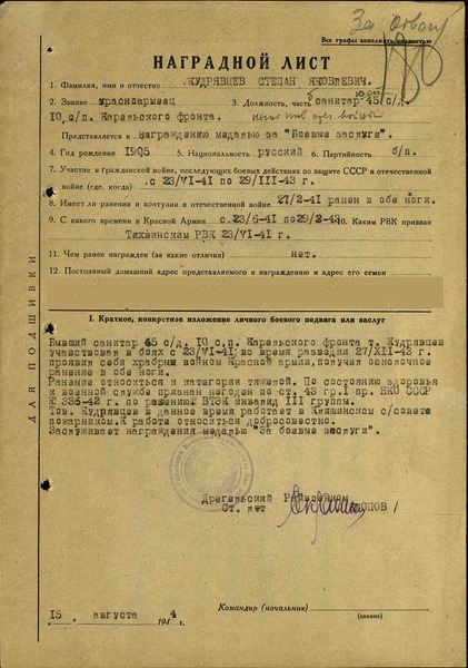 Кудрявцев Степан Яковлевич 1905» красноармеец, санитар, награждён МЕДАЛЬЮ «ЗА ОТВАГУ» (в наградном листе представлялся к Медали «За Боевые Заслуги»)