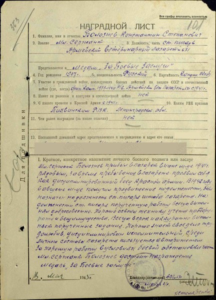 Болознев Константин Степанович 1907» мл. сержант, ст. писарь, армейский ветеринарный лазарет № 671, награждён МЕДАЛЬЮ «ЗА БОЕВЫЕ ЗАСЛУГИ»