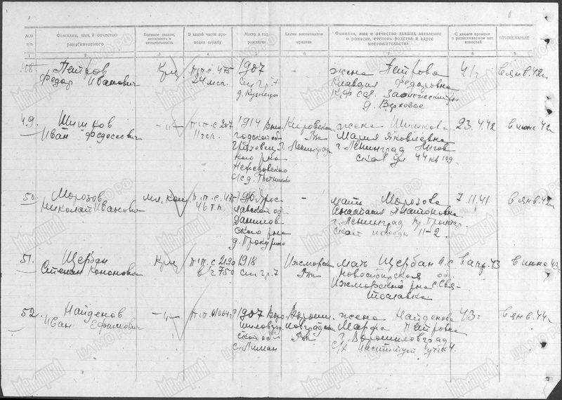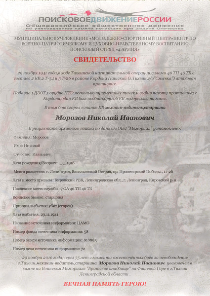 Морозов Николай Иванович (пост 1424 фиш 1916 2016_7/7 Смычка старшина личка сгорел 29.11.1941 46 ТП, 46 ТБ 50135346 408323558 408417903 3964478 ВПП нет подвиг нет